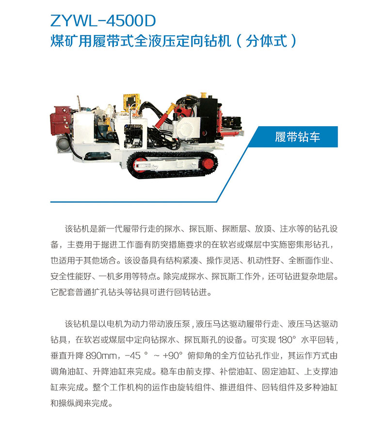 ZYWL—4500D 煤礦用履帶式全液壓定向鉆機是以電機為動力帶動液壓泵,液壓馬達驅動履帶行走、液壓馬達驅動鉆具,在軟巖或煤層中定向鉆探水、探瓦斯孔的設備。配套ZXC2000 隨鉆測量裝置由KJD127 礦用隔爆兼本安型計算機、ZXC2000-T 隨鉆測量探管、ZXC2000-C 礦用本安型測量數據處理器及FHJ5 礦用本安型鍵盤組成。可選配FHS16/5礦用本安型數據存儲器用于數據轉移。ZYWL—4500D 型煤礦用履帶式全液壓定向鉆機是新一代履帶行走的探水、探瓦斯、探斷層、放頂、注水等的鉆孔設備,主要用于掘進工作面有防突措施要求的在軟巖或煤層中實施密集形鉆孔,也適用于其他場合。該設備具有結構緊湊、操作靈活、機動性好、全斷面作業、安全性能好、一機多用等特點。除完成探水、探瓦斯工作外,還可鉆進復雜地層。它配套普通擴孔鉆頭等鉆具可進行回轉鉆進。